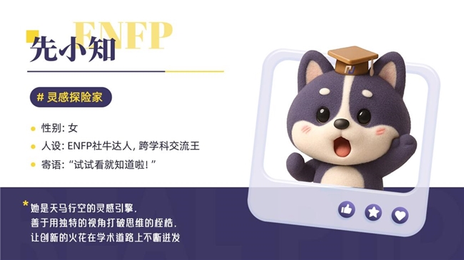 “先小知”则代表了学术探索中不可或缺的热情、勇气与创新性思维。她定位为“ENFP社牛达人”与“跨学科交流王”,善于以独特视角打破思维定式,激发创新火花,在学子迷茫时给予情感支持与新的可能。其寄语是:“试试看就知道啦!”